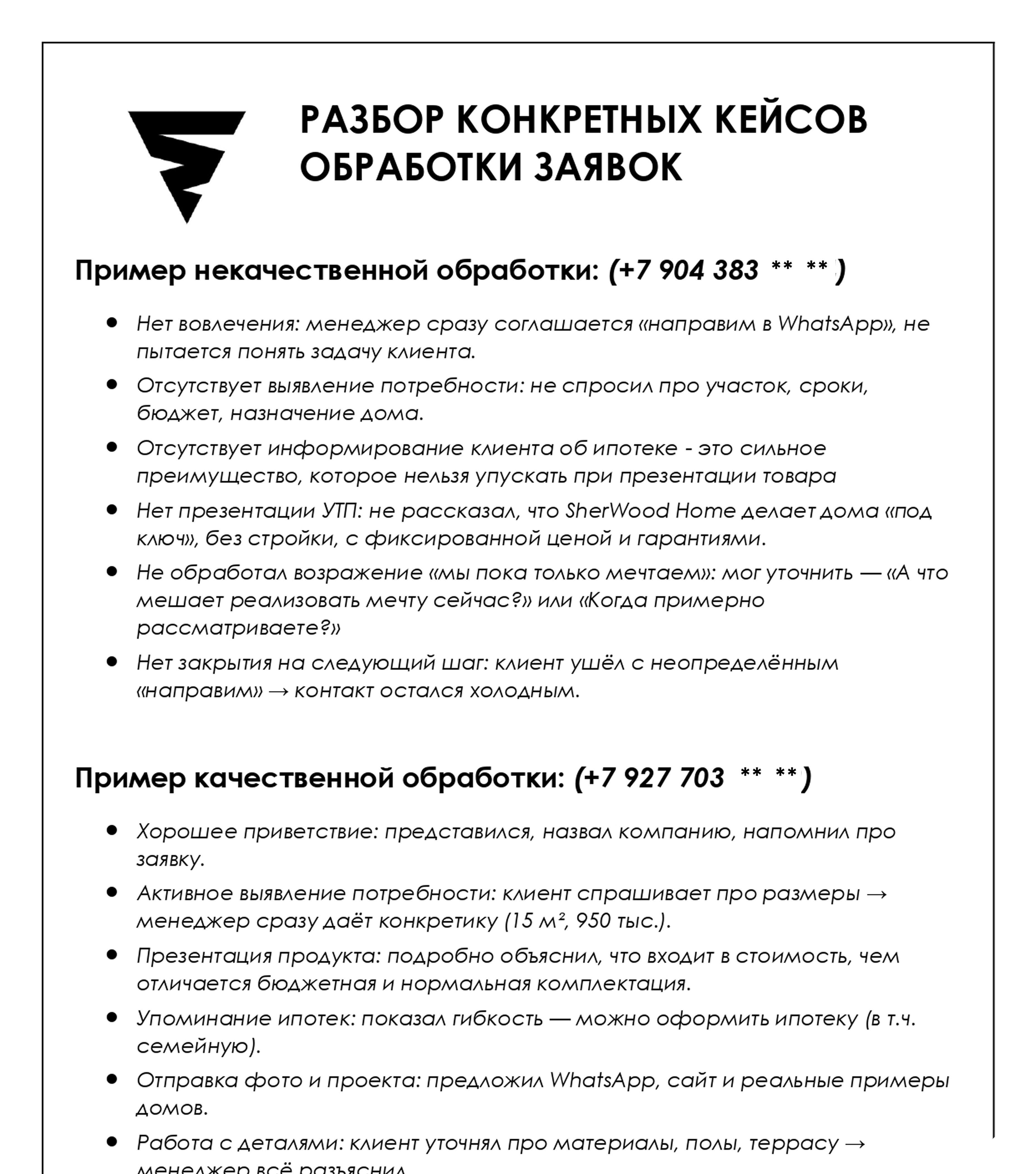 — Дает конкретные рекомендации по скриптам и обработке заявок.