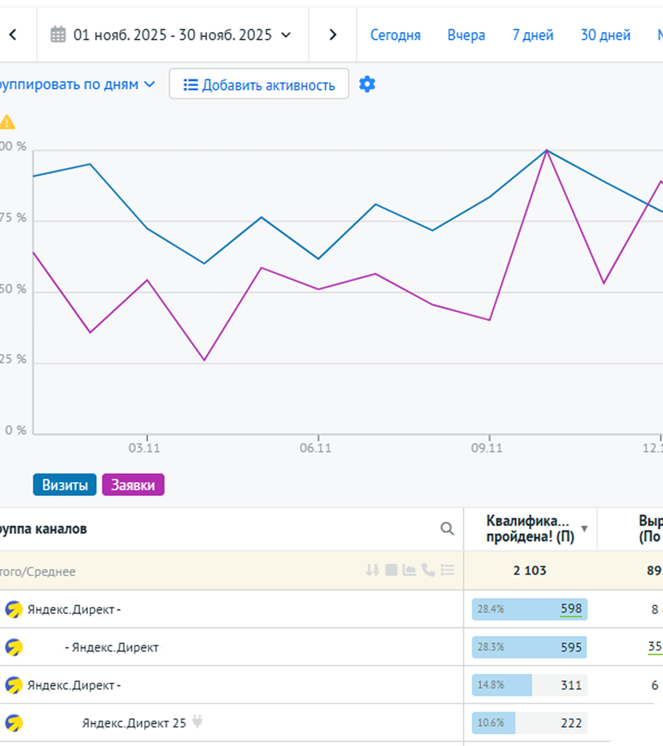 Каждая заявка считается. Видно, с какого канала пришёл клиент, сколько стоила заявка и сколько прибыли она принесла.