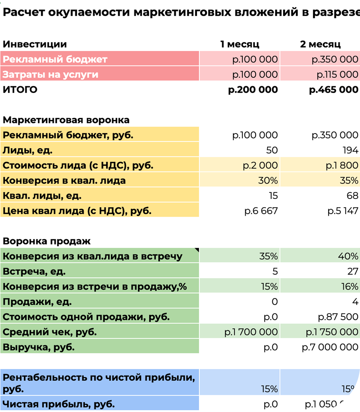 — Считаем юнит-экономику: количество лидов, конверсии, стоимость заявки, бюджет.
