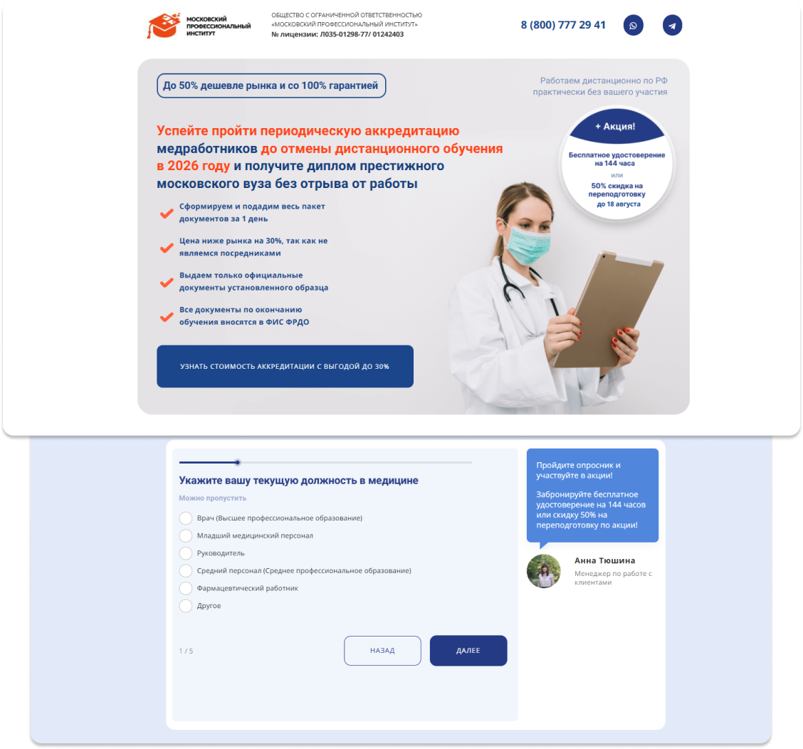 Миллионы инвестированного в рекламу бюджета, десятки успешных кейсов. Работаем в сферах: медицинская аккредитация, повышение квалификации мед работников, обучение охране труда, электробезопасности, пожарной безопасности, менеджменту и психологии, обучение другим 100+ специальностям.