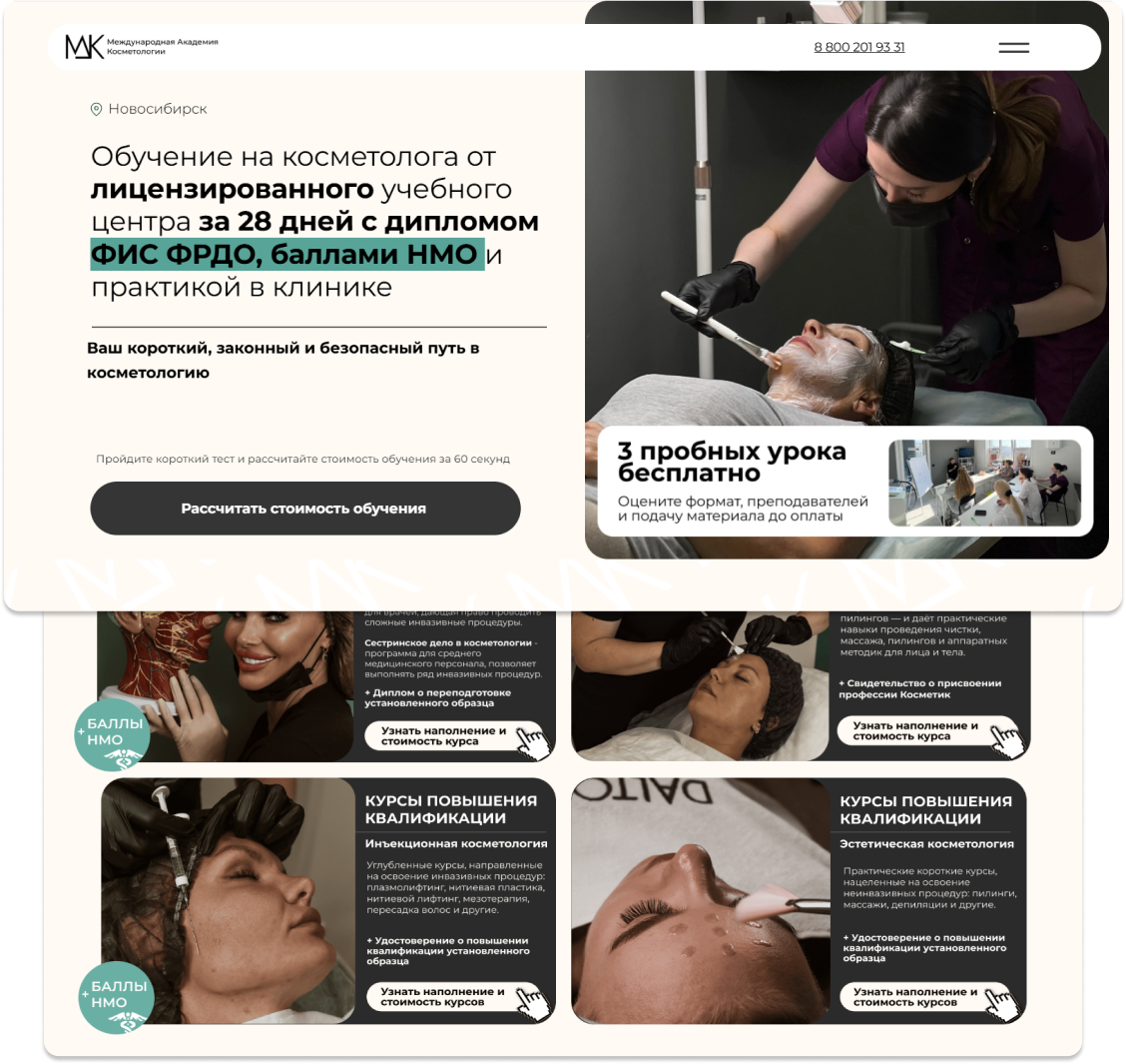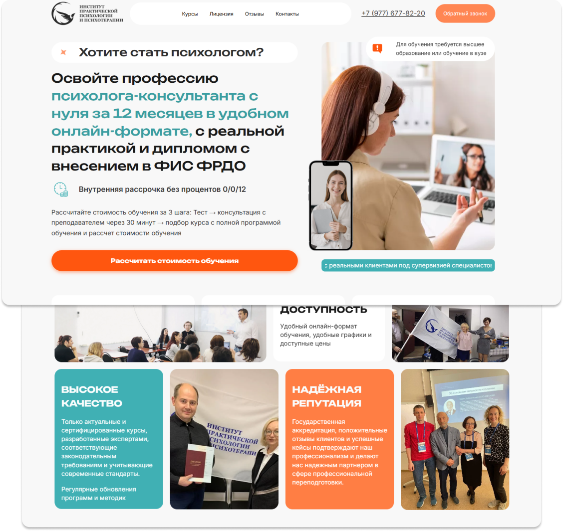 Миллионы инвестированного в рекламу бюджета, десятки успешных кейсов. Работаем в сферах: медицинская аккредитация, повышение квалификации мед работников, обучение охране труда, электробезопасности, пожарной безопасности, менеджменту и психологии, обучение другим 100+ специальностям.