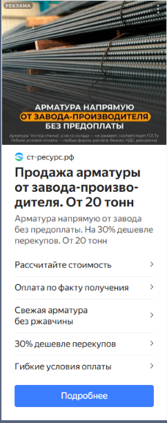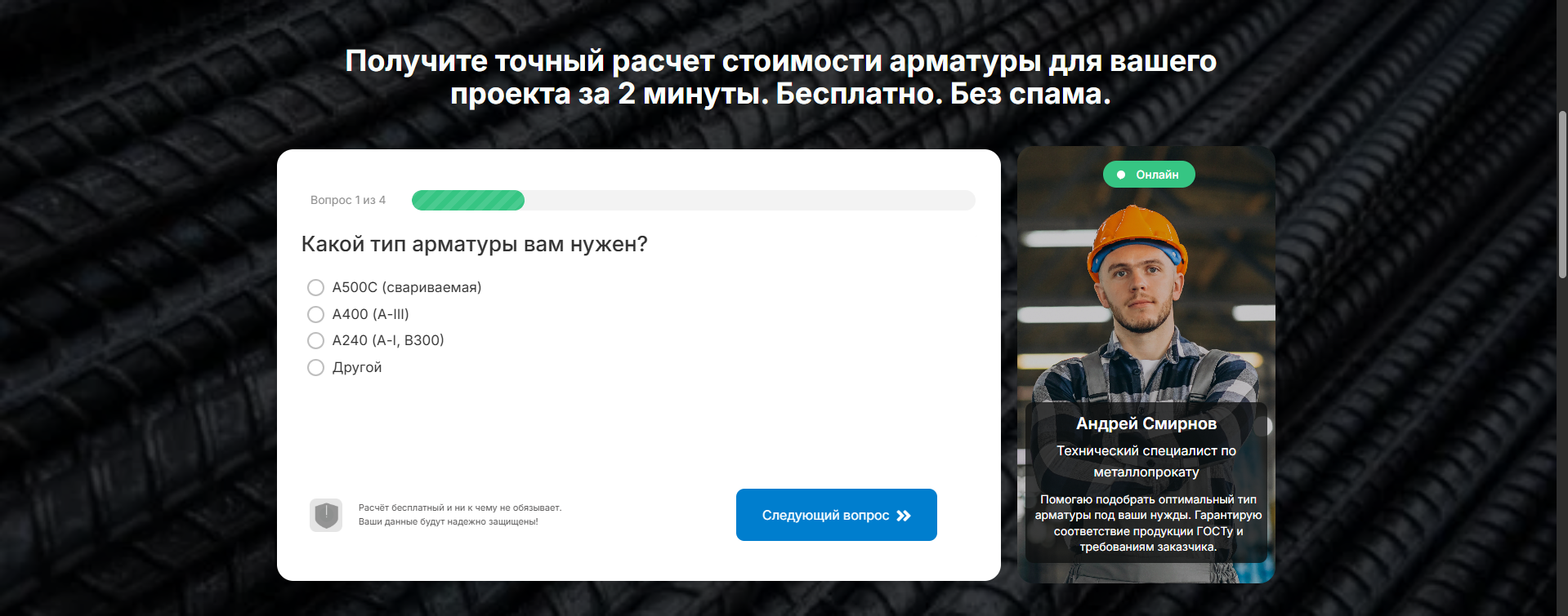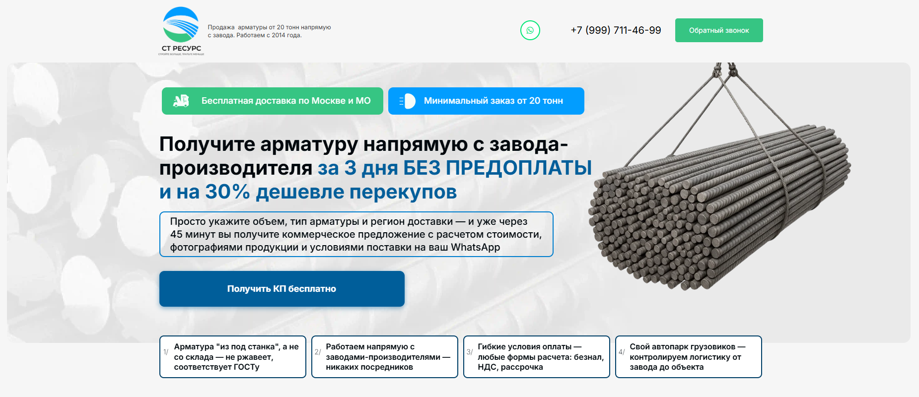 Мы начали с аналитики рынка металлопроката. Исследовали поисковый спрос, конкурентов и тендерные площадки. Выделили конкретные типы арматуры, по которым был устойчивый спрос — A500, A400 диаметром 10–25 мм.