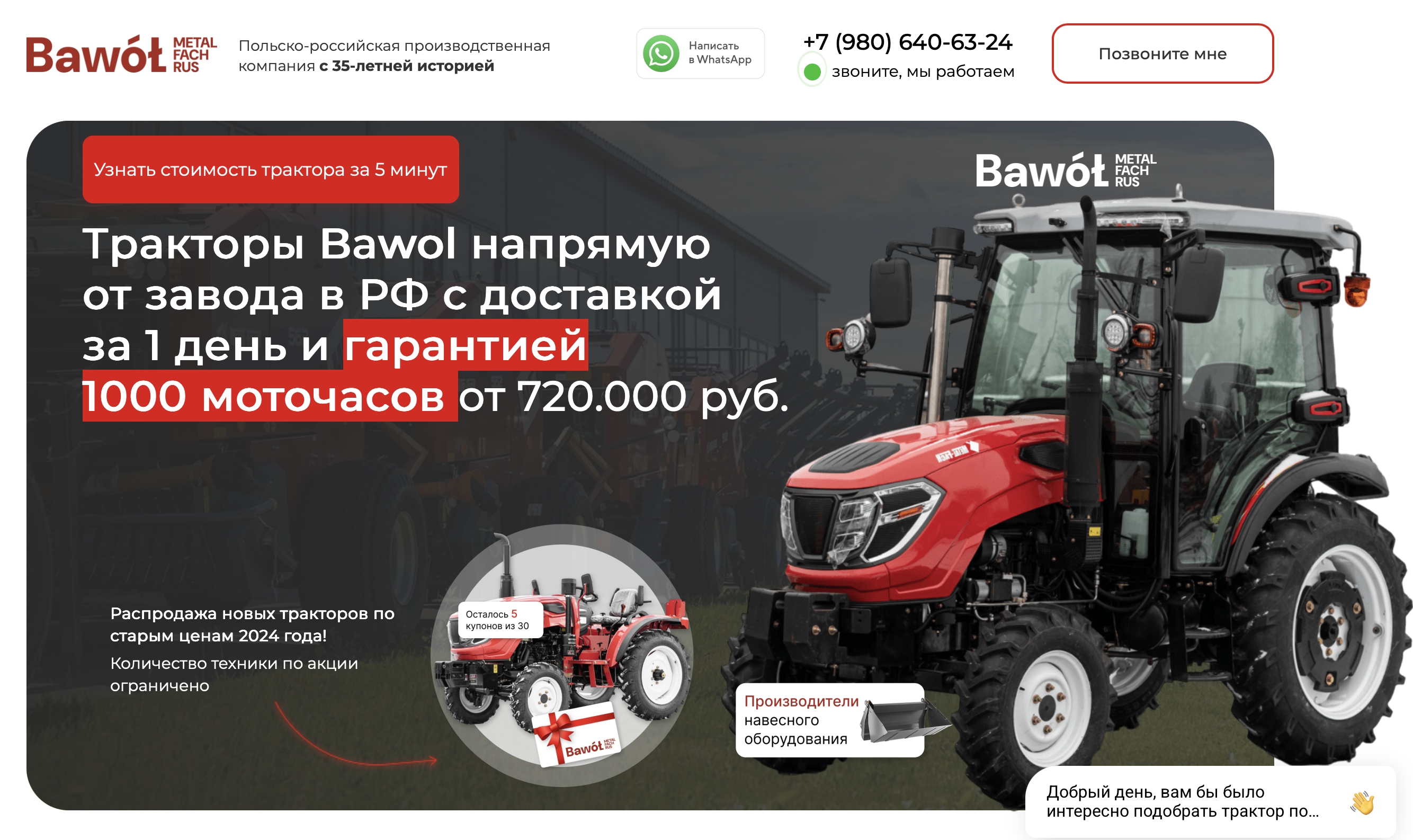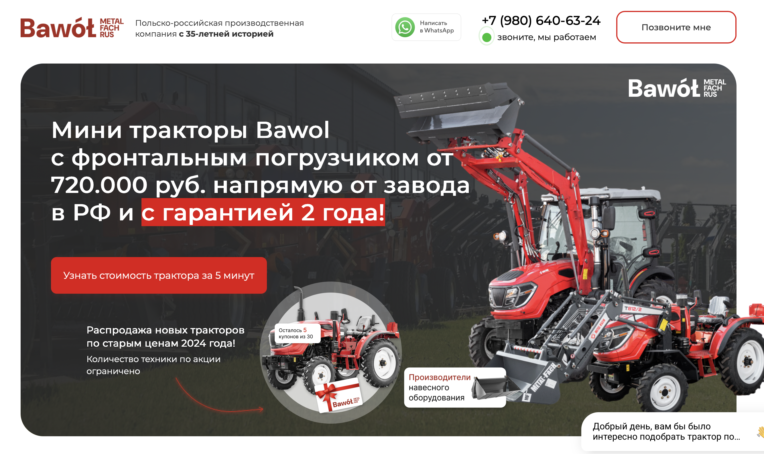 После месяца работы мы проанализировали, какие запросы чаще всего поступают в отдел продаж. Выяснилось, что наибольший интерес вызывает минитрактор с фронтальным погрузчиком.