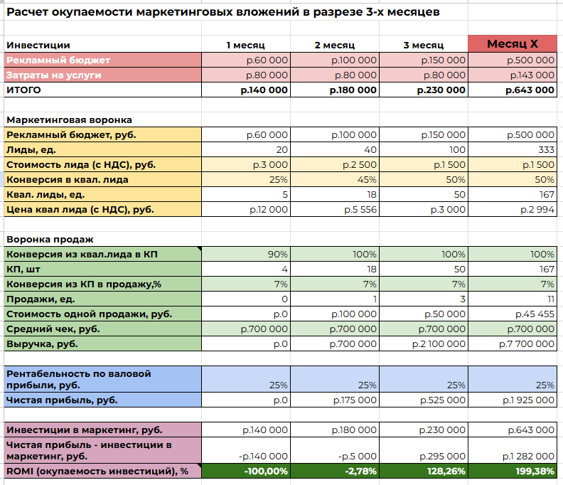 Перед стартом работ мы сделали расчет окупаемости воронки на 3 месяца вперед:
