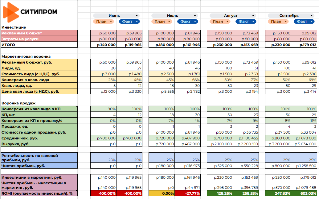В этой статье я рассказываю о том, как мы за 5 месяцев помогли компании «Ситипром», начинающему дилеру винтовых компрессоров, выстроить системный маркетинг с нуля и заработать 7,7 млн рублей за 4 месяца рекламы при окупаемости 603% ROMI.