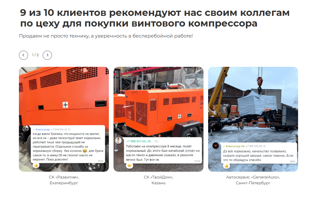 Дополнительно связались с представителями завода-поставщика в Санкт-Петербурге, уточнили более тонкие технические моменты (для нашей ЦА это важно) и запросили реальные фото оборудования с завода — чтобы сайт вызывал доверие и лиды приходили уже “тёплыми”.