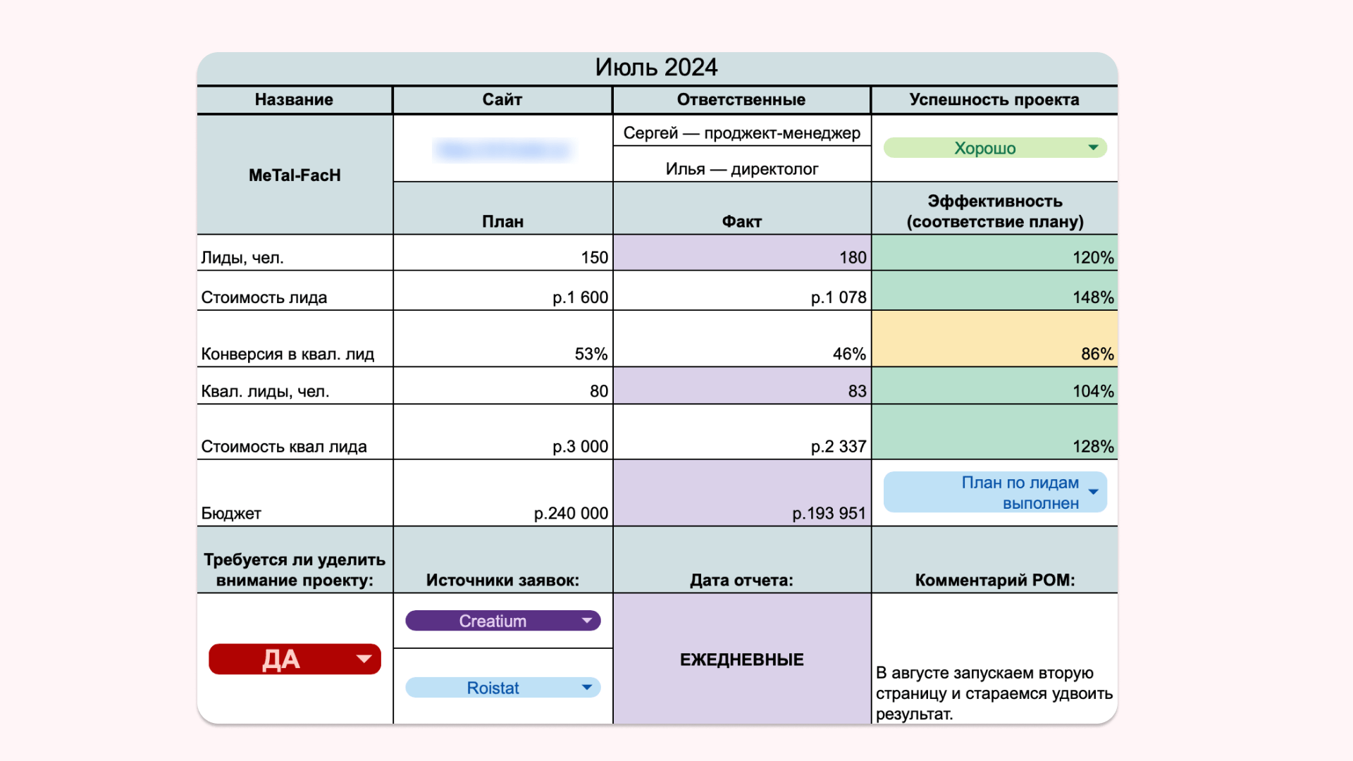 Также с данным клиентом мы внедрили ежедневные РНП. На них наш проджект-менеджер и маркетолог клиента совместно анализируют количество и качество заявок.