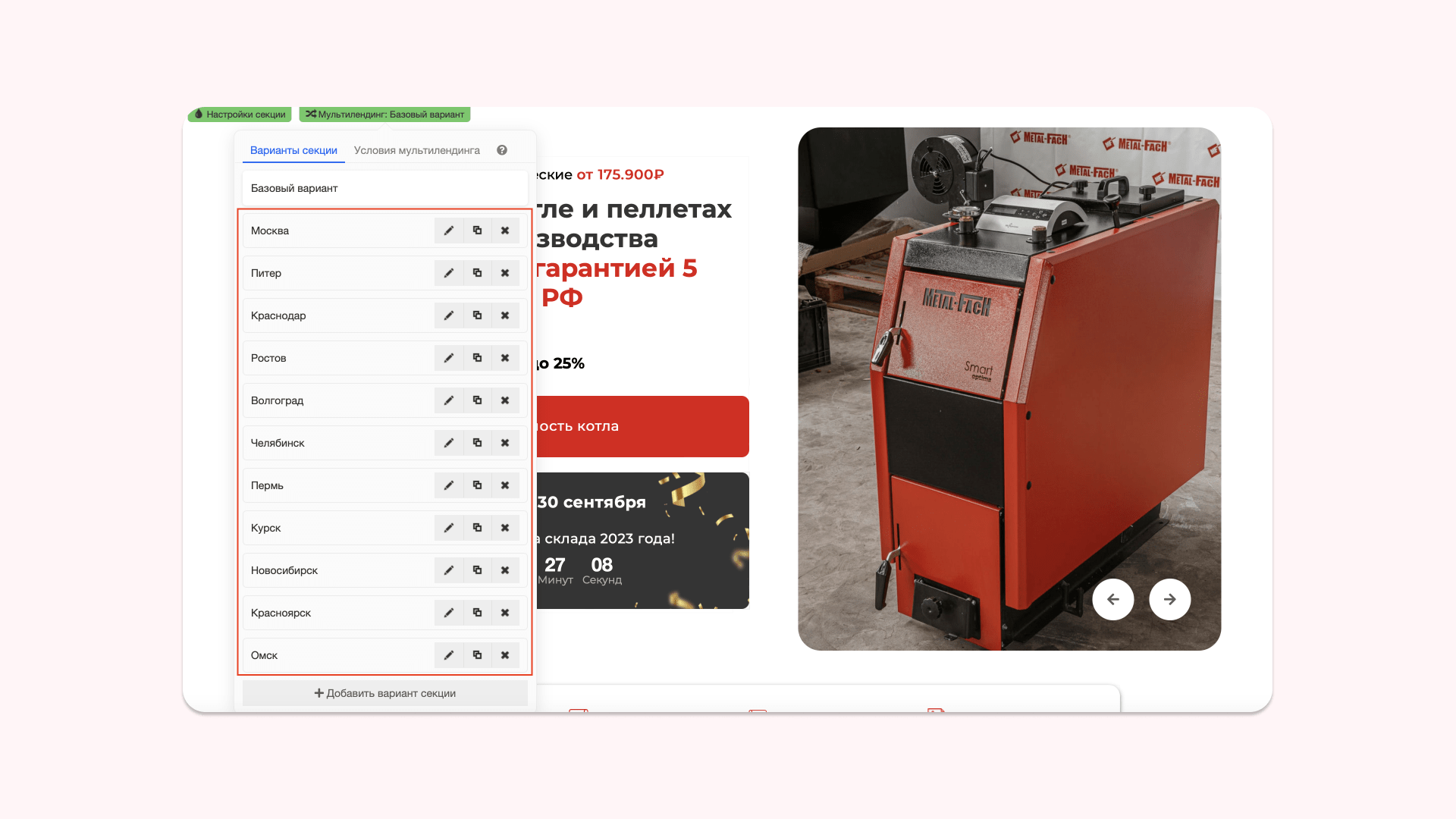 Наш клиент работает по всей РФ, но есть регионы, на которые он хотел бы сделать особый акцент в работе. Мы учли этот момент и сделали 11 мультилендингов по каждому направлению.