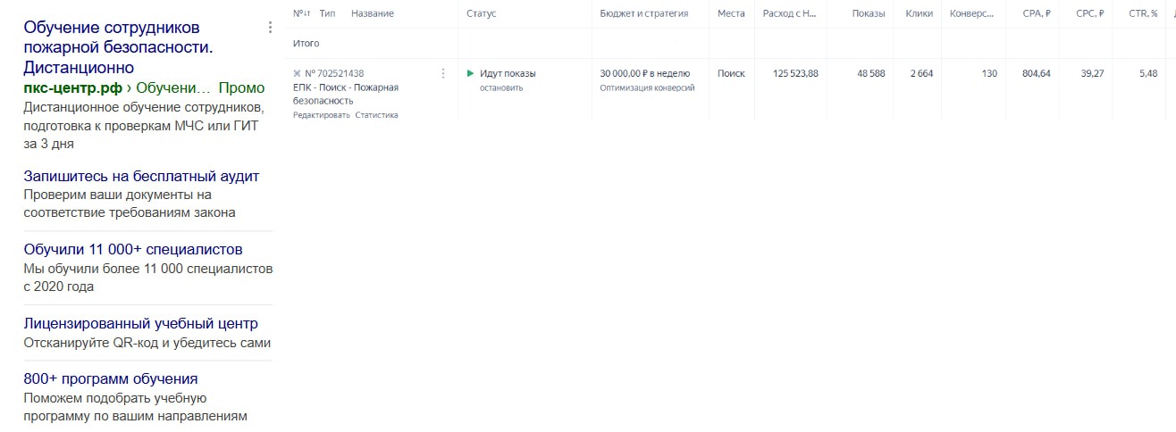 Анализ первых результатов показал, что группа объявлений, посвященная пожарной безопасности, показывает лучшие результаты. Поэтому мы выделили эту группу в отдельную РК: она также прошла обучение и легко масштабировалась. Конкретно в этом направлении мы сразу делали недельный бюджет чуть больше, чем в других, так как знали про повышенный спрос, с 1 сентября 2025 года по этому направлению были изменения в законодательстве, которые побуждали к обучению.