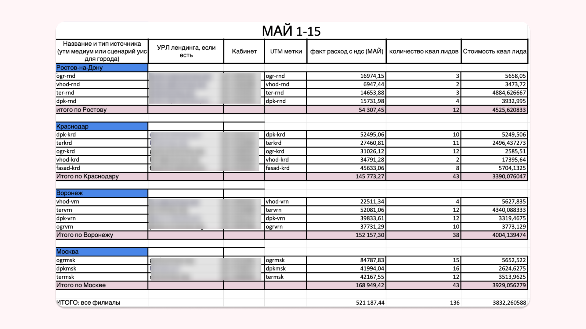 Мы не просто восстановили поток заявок для клиента после его возвращения — мы выстроили отлаженную систему, которая стабильно генерирует свыше 300 квалифицированных лидов в месяц по рекордно низкой цене — 2 712 рублей.