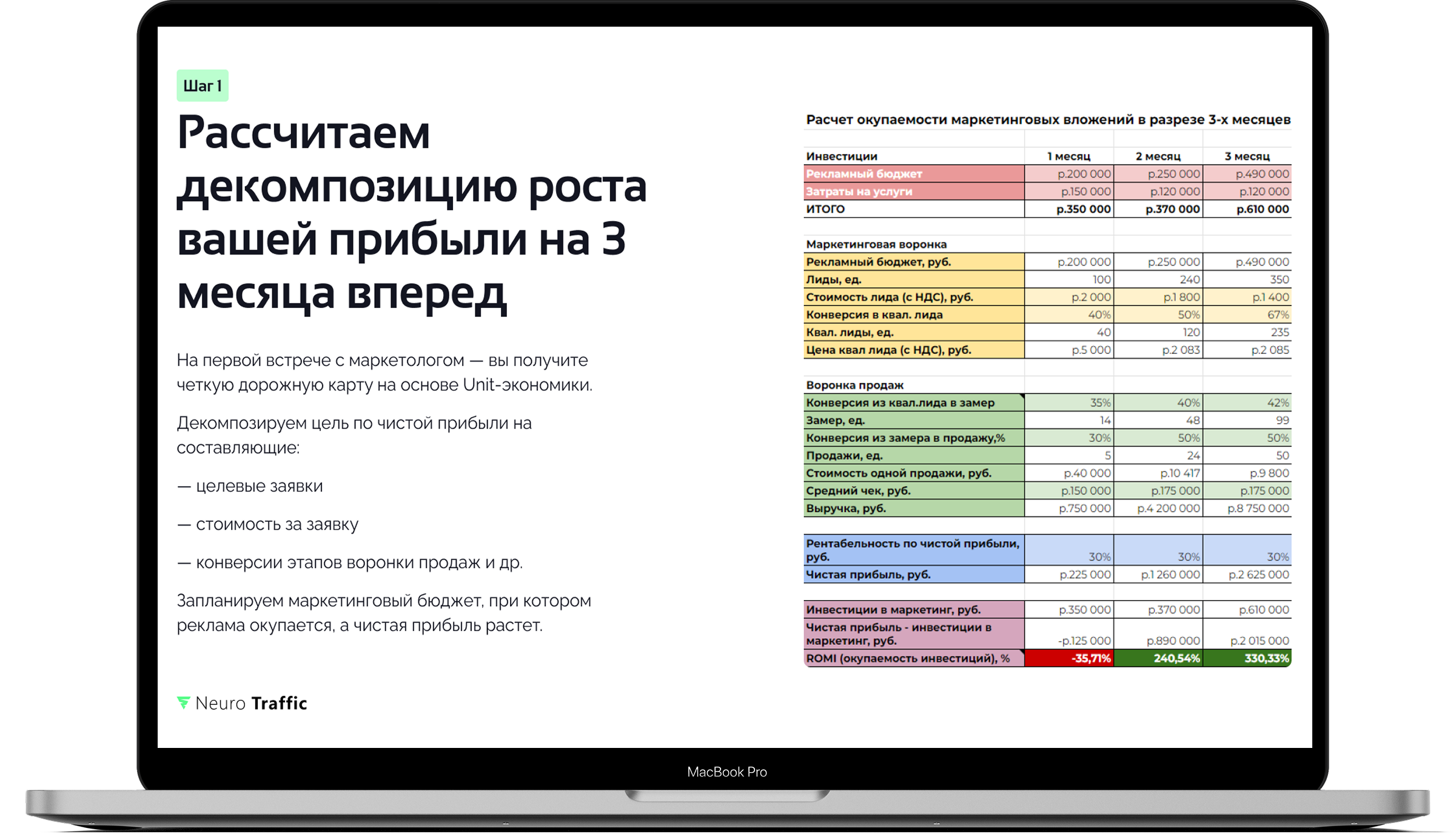 NeuroTraffic — отдел маркетинга, который усиливает сильных, а не спасает слабых. Мы приняли решение не работать с теми, кто еще не имеет никаких результатов. А помогать тем, кто уже имеет классные результаты по выручке и прибыли — стать еще сильнее.